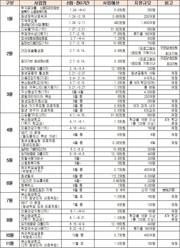 월별로 여러 사업이 진행되는 만큼 각 사업에 대한 신청 접수 기간 등 세부 사항은 ‘부산 청년정책 플랫폼’ 사이트를 통해 확인할 수 있다.