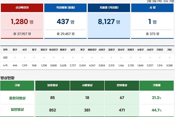 부산지역 내 일일 확진자가 어제(2일)에 이어 오늘도 천명대를 기록하며 폭증한 반면, 지역 내 중증 환자 수는 전혀 오르지 않으며 현재 상태를 유지하고 있는 모습이다. 때문에 중환자 병상은 가동률이 상대적으로 널널한 반면, 경증 환자 치료지인 생활치료센터 등의 가동률은 상당히 오른 모습이다.