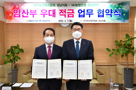 NH농협은행 경남본부는 7일 인구보건복지협회 경남지회와 임산부를 배려하는 문화 확산 및 활성화를 위한 ‘임산부 우대적금’ 업무협약식을 체결했다고 밝혔다.