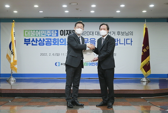 한편 이재명 후보는 이날 부산상의 방문에 앞서 부산항국제전시컨벤션센터에서 공약 발표 기자회견을 열고 9대 공약으로 ▲가덕신공항 2029년까지 개항 ▲2030 세계박람회 부산 유치의 성공 기반 마련 ▲해운산업 메카 도시 부산 육성 ▲수소경제 허브 육성과 친환경 미래 산업 전환 지원 ▲부산 블록체인 특구 육성, 활성화 ▲글로벌 문화, 예술, 관광 도시 부산 조성 ▲부울경 메가시티 1시간 생활권 실현 ▲경부선 지하화 마스터플랜 추진 ▲부산 공공의료 벨트 완성에 대한 방안을 설명했다.