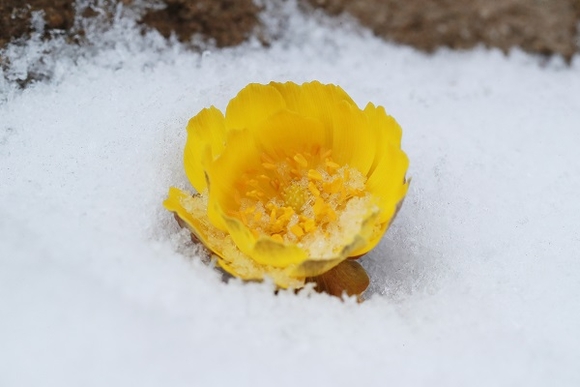 절기상 입춘(立春)인 지난 4일 경남 함양군 병곡면 대봉산휴양밸리 일원에 봄의 전령사로 불리는 복수초가 쌓인 눈을 비집고 꽃망울을 터트리고 있다. (사진=함양군 제공)