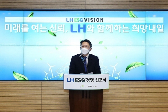 한국토지주택공사(이하 LH)는 8일 진주 본사에서 ‘LH ESG 경영 선포식’을 개최하고, 2022년을 ESG 경영의 원년으로 삼아 ESG 경영을 전면 도입할 것을 선언했다.