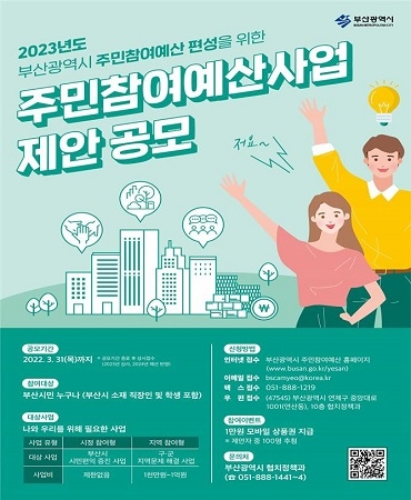 부산시가 내년도 예산 편성을 위해 ‘2023 주민참여예산’에 반영할 사업을 내달 31일까지 접수한다고 9일 공고했다.