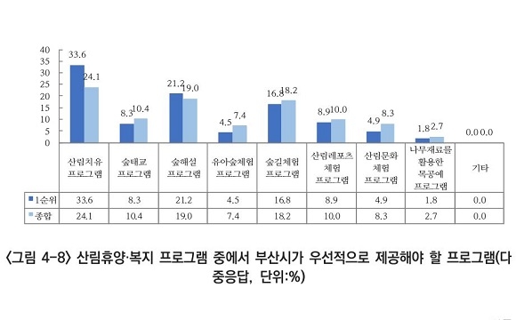 부산시에서 최우선으로 제공해야 할 산림휴양·복지 프로그램에 대한 질문에서는 ‘산림치유 프로그램’을 응답자의 24.1%가 꼽으며 가장 높은 비중을 차지했다. 이어 ▲숲 해설 프로그램(19.0%) ▲숲길 체험 프로그램(18.2%) ▲숲 태교 프로그램(10.4%) 등의 순으로 응답률이 높았다.