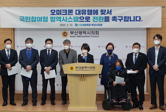 더불어민주당 소속 부산시의원들이 10일 오전 시의회 브리핑실에서 기자회견을 열고 부산시에 코로나19 오미크론 대유행에 맞서 ‘국민참여형 방역체계’ 도입을 촉구했다.