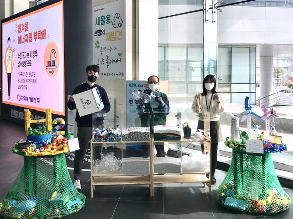 동서발전은 이날 본사(울산 소재) 1층 로비에서 새활용 연구소와 함께 ‘정크아트 전시회’를 열어 폐플라스틱 병뚜껑, 장난감 등 일상생활에서 나온 폐품을 소재로 친환경 에너지를 형상화한 예술 작품을 선보였다.
