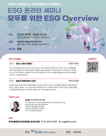 권형택 HUG 사장은 “중견·중소기업의 성장을 지원하기 위해 이번 ESG 온라인 세미나를 열게 됐다”며 “앞으로도 우리 공사는 상생협력을 통한 ESG 가치 확산에 앞장서겠다”고 전했다.