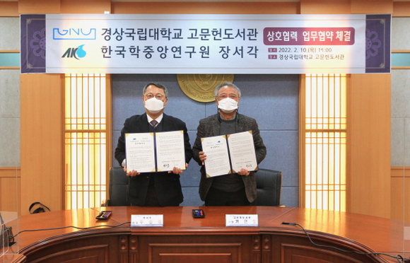 경상국립대학교 고문헌도서관과 한국학중앙연구원 장서각은 소장한 고문헌의 공동 학술 연구 및 상호 대여 전시 등 양 기관의 상호협력을 위해 지난 10일 오후 5시 대학 가좌캠퍼스 본관 4층 소회의실에서 업무협약을 체결했다.