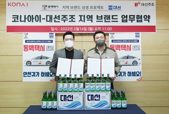대선주조㈜가 부산 지역화폐 동백전과 동백택시 운영사인 코나아이㈜와 14일 오전 대선주조 본사에서 ‘부산지역 브랜드 상생 프로젝트 협약’을 체결하고 공동 마케팅에 나섰다고 밝혔다.