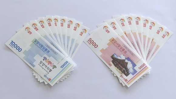 시는 밀양형 지역경제 활성화 대책의 핵심인 지역경제 선순환 체계 회복을 위해 밀양사랑상품권을 역대 최대 규모인 800억원 발행하고 1인당 구입한도도 월 50만원에서 100만원으로 확대한다. 이는 시민 1인당 77만원 정도를 구입할 수 있는 규모로 10% 할인 또는 인센티브를 적용할 경우 1인당 7만 7천원의 혜택을 받는 셈이다.