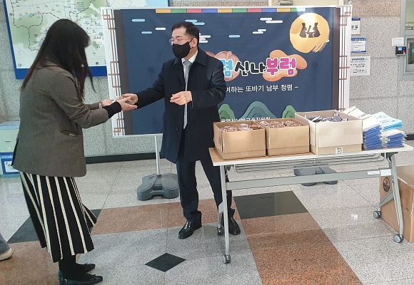 부산시남부교육지원청이 내부 청렴의식 제고를 위해 15일 오전 본청 1층 출입구에서 출근하는 직원을 대상으로 ‘출근길 청렴 소통의 날, 남부 청렴신나부럼’ 행사를 진행했다고 밝혔다.