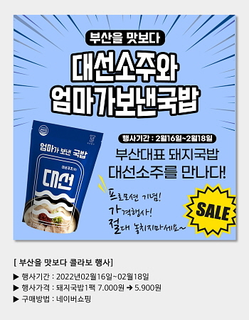대선주조㈜가 부산지역 식품업체 ‘프론티어식품㈜’과 함께 ‘대선소주와 엄마가 보낸 국밥’ 제품 콜라보 행사를 16일부터 3일간 진행한다고 15일 밝혔다.