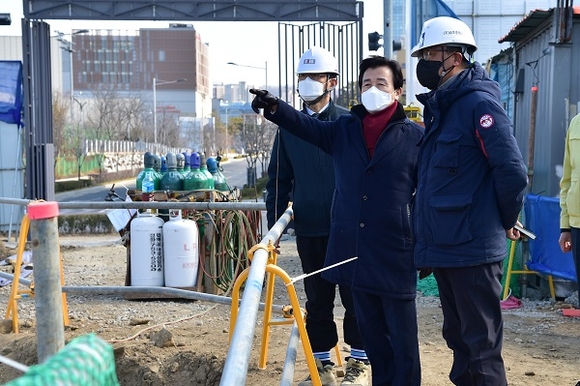 조규일 진주시장은 16일 '경남진주혁신도시 복합혁신센터' 공사 현장을 찾아 중대재해 예방을 위한 안전점검과 공사 진행 사항을 점검하고, 감리단장과 현장근무자에게 안전사고 예방을 위한 노력을 당부했다.