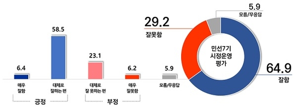 조사결과에 따르면 민선 7기 시정운영 평가에 대해 '잘하고 있다'는 응답이 64.9%, '잘 못하고 있다'가 29.2%로 나타났다. 거주 만족도에서는 63.7%가 다른 지역보다 살기 좋다고 답했고 비슷하다는 27.8%, 살기 나쁘다고 답한 사람은 7.6%밖에 되지 않아 시민들의 거주만족도가 전반적으로 높은 것으로 나타났다.