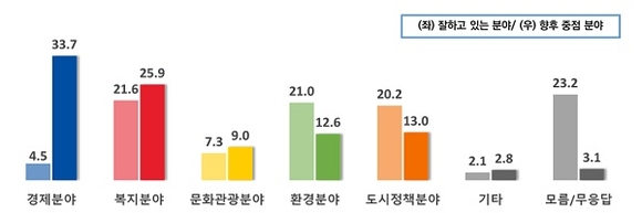 시정운영에서 잘하고 있는 분야는 복지 분야가 21.6%, 환경 분야 21.0%, 도시정책 분야 20.2% 순으로 나타났으며, 향후 중점 추진분야는 경제 분야 33.7%, 복지 분야 25.9%, 도시정책 분야 13.0% 순으로 코로나 19로 인한 경기 침체로경제 활성화를 최우선으로 추진할 과제로 꼽았다.
