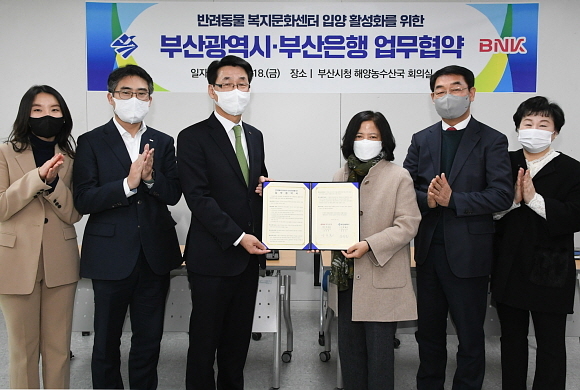 BNK부산은행과 부산시가 18일 오후 시청에서 ‘유기동물 입양 활성화 업무협력 협약’을 체결했다고 밝혔다.