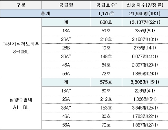 LH는 지난 15일부터 18일까지 과천지식정보타운 S-10BL 605호 및 남양주별내 A1-1BL 576호를 대상으로 청약접수를 실시했다.