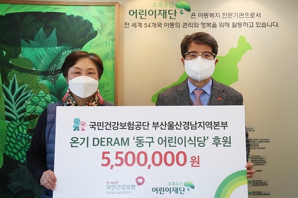 국민건강보험공단 부산울산경남지역본부는 21일 초록우산 어린이재단 부산종합사회복지관에서 '온기DREAM 어린이 식당' 사업 사회공헌기금을 전달했다고 밝혔다.