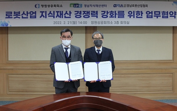 창원상공회의소 경남지식재산센터와 (사)경남로봇산업협회가 지난 21일 창원상의 3층 의원회의실에서 '로봇산업 지식재산 경쟁력 강화를 위한 업무협약'을 체결했다.