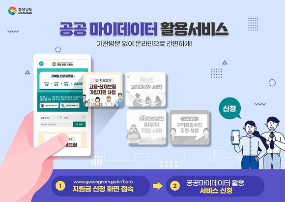 경남도는 '공공 마이데이터 활용서비스' 시범구축을 완료하고 올해 '1인 자영업자 고용·산재보험료 지원사업'을 시작으로 4개의 도 지원사업 신청 서비스를 시행한다고 24일 밝혔다.