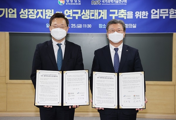 경남도와 국가과학기술연구회는 25일 도청 도정회의실에서 도내 기업의 성장지원 및 공동연구 생태계 기반 구축을 위한 업무협약을 체결하고, 연구개발의 혁신기반 조성을 위한 채비에 나섰다.