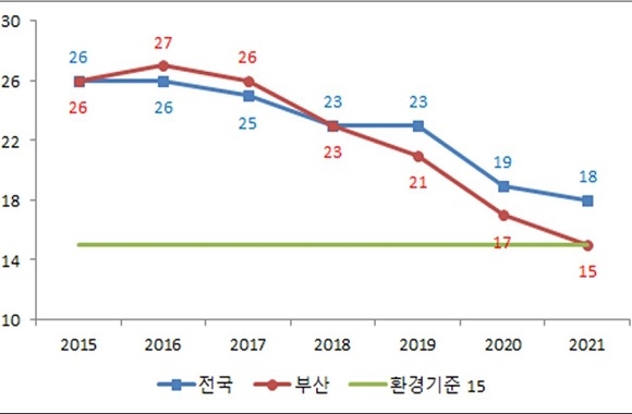 지난해 부산지역의 ‘초미세먼지 연평균 농도’는 15㎍/㎥를 기록하며 지난 2015년 공식 관측 이래 처음으로 ‘환경부 환경기준’을 달성했다. 아울러 전국 7대 특·광역시 가운데 가장 낮은 수치를 기록한 것으로 나타났다.