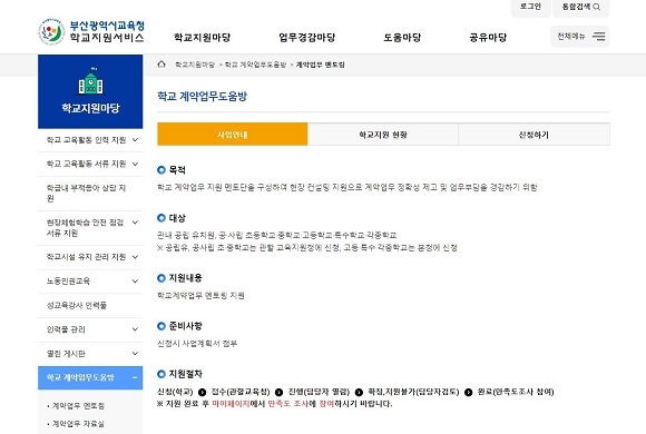 부산시교육청이 각 학교의 계약 업무를 상시 지원하기 위해 내달 중으로 ‘학교 계약업무 도움방’ 웹사이트를 오픈한다고 28일 밝혔다.