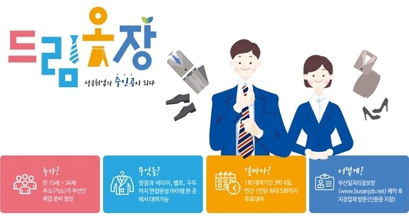 부산경제진흥원과 부산시가 지난 1일부터 부산지역 청년층을 대상으로 면접용 무료 정장 대여서비스 ‘드림옷장’ 사업을 재개했다고 2일 밝혔다.