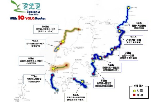한편 욜로 갈맷길 10선의 코스는 ▲1코스 갈맷길 더 비기닝 ‘임랑해수욕장~기장군청(12㎞)’ ▲2코스 시크릿 커피로드 ‘기장군청~송정해수욕장(16㎞)’ ▲3코스 블루라인 푸른 모래 ‘구 송정역~미포(5㎞)’ ▲4코스 센텀 무비투나잇 ‘마린시티~광안리(5㎞)’ ▲5코스 오륙도 날씨 지긴다 ‘이기대~동생말(4.5㎞)’ ▲6코스 영도 흰여울 가즈아 ‘영도대교~아미르공원(16㎞)’ ▲7코스 선셋 피크닉 ‘신평~다대포(8㎞)’ ▲8코스 낙동정맥 순례길 ‘승학산~구덕산(12㎞)’ ▲9코스 인생 삼락길 ‘삼락생태공원~구포역(10.5㎞)’ ▲10코스 금정산성 나들이 ‘구포역~금정산성 동문(11㎞)’이다.