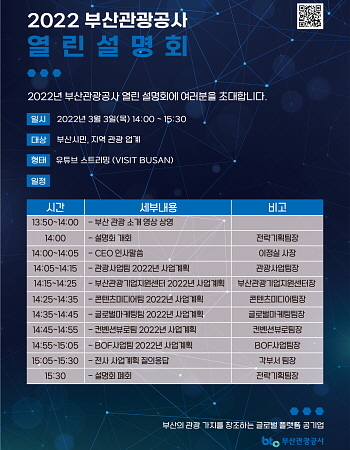부산관광공사가 시민과 지역 관광업계와 함께 부산 관광의 미래를 만들기 위해 오는 3일 공사 공식 유튜브 채널에서 ‘2022 부산관광공사 열린 설명회’를 개최한다고 2일 밝혔다.