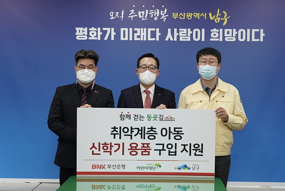 BNK부산은행이 3일 오전 부산 남구청에서 부산시 남구, 초록우산어린이재단과 함께 신학기 학생 지원 사업 ‘함께 걷는 등굣길 전달식’을 열고 신학기 학생용품을 후원한다고 밝혔다.