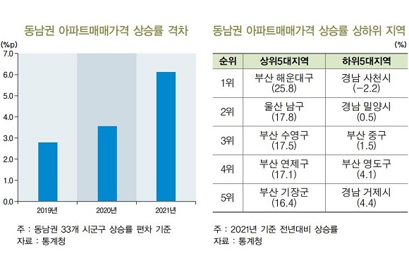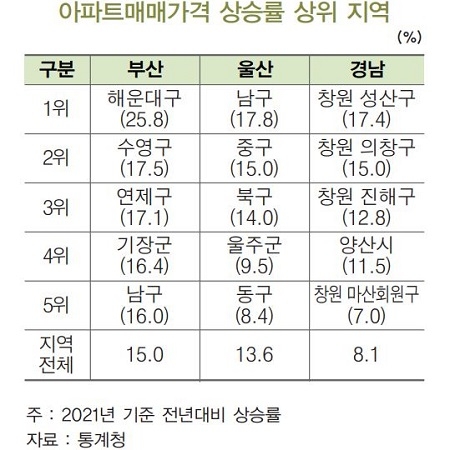 해당 보고서에 따르면 지난해 동남권 아파트의 매매가는 12.2% 상승하며 지난 2011년(19.9%) 이후 최대 상승률을 기록한 것으로 조사됐다. 지역별로는 부산이 15.0%로 가장 높은 상승률을 보였으며 이어 울산(13.6%), 경남(8.1%) 순으로 확인됐다.