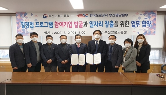도공 부경본부는 부산고용노동청과 지난 2일 협약을 맺고, 부산고용노동청 각 지역 고용센터 및 민간위탁사업자의 고용지원 서비스를 활용해 부경본부 관내 휴게소, 영업소 일자리 창출을 위한 일-경험 프로그램을 도입, 상호 협력키로 했다.