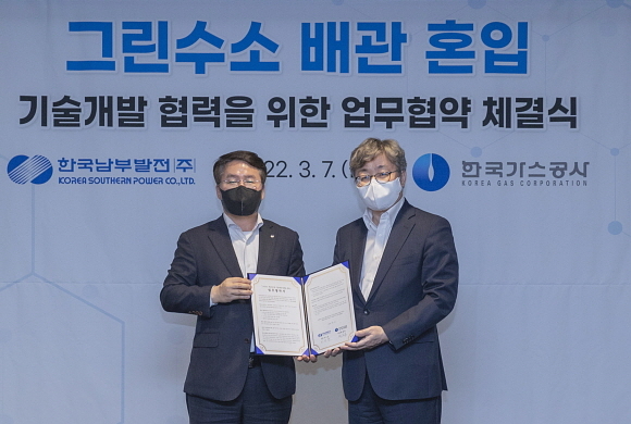 한국남부발전㈜이 한국가스공사㈜와 7일 제주 그랜드조선 호텔에서 ‘그린 수소 배관 혼입 공동 기술개발 협약’을 체결했다고 밝혔다.