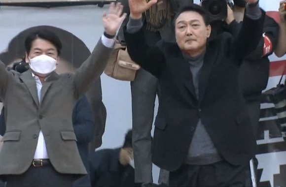 윤석열 대선 후보가 선거운동 마지막 날인 8일, 마지막 선거운동지로 ‘부산’을 택했다. 윤 후보는 이날 오후 1시경 안철수 국민의당 당대표와 함께 부산 연제구 온천천을 찾아 유세를 펼쳤다.