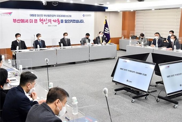 금일(10일) 이른 오전 20대 대통령 당선인이 결정된 가운데, 부산시는 박형준 부산시장이 이날 오전 10시 ‘부산발전 공약 국정과제화 보고회’를 신속히 열어 대응했다고 밝혔다.