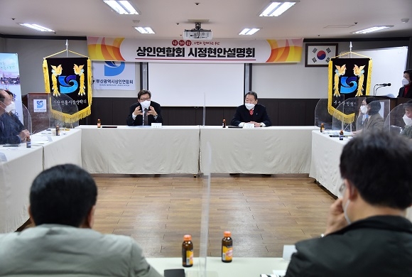 부산시는 지난 14일 오후 박형준 시장이 부산시상인연합회 교육관을 찾아 상인연합회를 대상으로 ‘2차 소통·공감 릴레이’ 시정 현안 설명회를 진행했다고 15일 밝혔다.