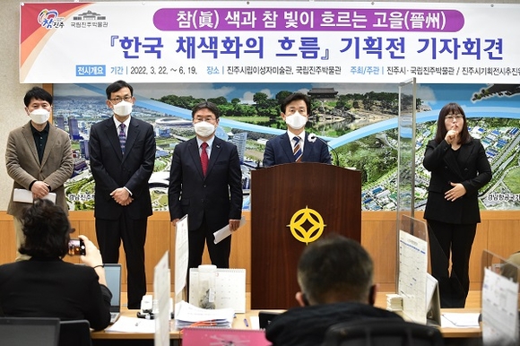 경남 진주시는 14일 시청 브리핑룸에서 권순기 경상국립대 총장, 장상훈 국립진주박물관장, 구대회 기획전시실무 추진부위원장과 함께 '한국 채색화의 흐름: 참(眞) 색과 참 빛이 흐르는 고을(晉州)' 공동 기획전의 최종 작품 전시 계획을 발표했다.