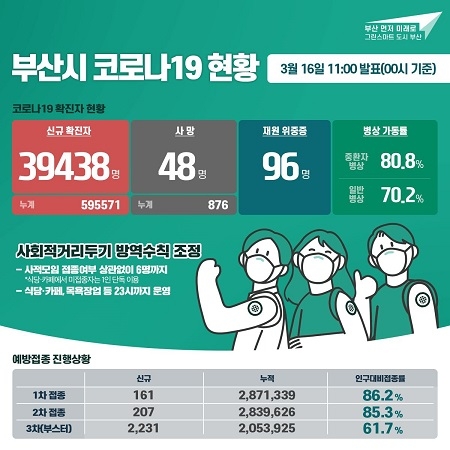 시 방역당국은 16일 코로나19 일일 서면 브리핑을 통해 어제(15일) 하루 동안 지역 내 코로나19 신규 확진자가 총 3만 9438명 나와 누계 59만 5571명을 기록했다고 발표했다.