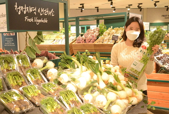 롯데백화점 부산본점 지하 2층 푸드에비뉴에서 최근 봄 제철 나물과 야채 등을 판매하고 있는 가운데 백화점 모델이 봄나물을 들어보이고 있다. 롯데백화점 부산본점에 따르면 푸드에비뉴에서 현재 봄철 청도 미나리, 가시두릅, 고흥 햇양파 등을 판매하고 있다. (사진=롯데쇼핑 제공)