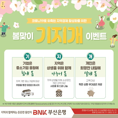BNK부산은행이 코로나19 사태 장기화로 침체한 지역경제 활성화와 응원 차원에서 기업과 개인 고객을 대상으로 봄맞이 이벤트 ‘기·지·개’를 시행한다고 17일 안내했다.