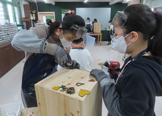 먼저 디지로그 과정에서 ‘손으로 생각하기’를 주제로 목재, 천, 재활용품 등을 활용한 재가공 실습 등을 진행한다. 이를 통해 목공 기계와 공구의 원리를 이해하며 심미적 사고, 공동체 역량 등을 함양한다.