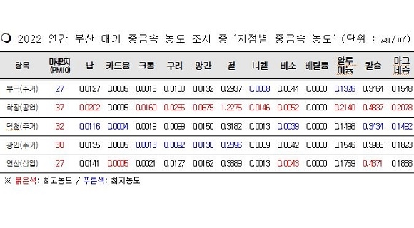 대기 중금속 조사는 대기 중금속 측정망을 운영해 미세먼지(PM-10) 가운데 포함된 중금속 12개 항목을 분석하는 방식으로 진행됐다. 시 보건환경연구원의 해당 조사는 시내 주거지 ‘광안동’ ‘부곡동’ ‘덕천동’ 3곳과 상업지 ‘연산동’ 1곳, 공업지 ‘학장동’ 1곳에서 매년 시행되고 있다.