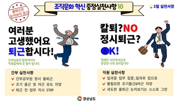 3월은 불필요한 야근 문화를 감축하기 위한 '출퇴근은 눈치 보지 않고'를 중점과제로 삼아 도 및 직속기관·사업소에 포스터 및 배너를 배포했고 청내 방송, 직원 컴퓨터 알림창, 가족사랑의 날 초과근무 현황 게시 등 다방면으로 캠페인 활동을 추진 중이다.
