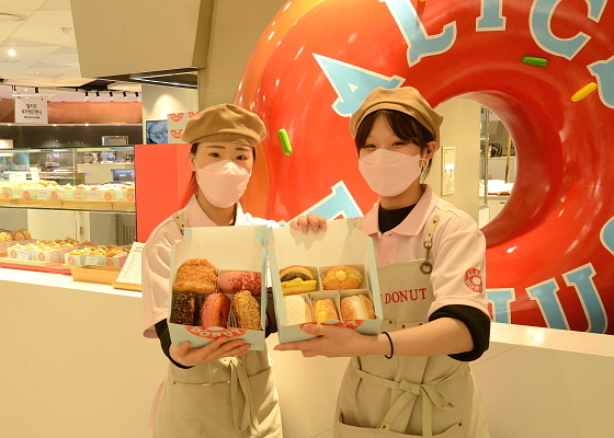최근 롯데백화점 부산본점 지하 2층 푸드 에비뉴에서 부산 청사포 지역 유명 도넛가게 ‘앨리스 도넛’ 팝업 행사가 열린 가운데 직원들이 제품을 들어보이고 있다. 롯데백화점 부산본점에 따르면 해당 팝업 행사에서는 ‘앙버터’ ‘바닐라 커스타드’ ‘우유 생크림’ 등 11종의 도넛 제품을 선보인다. (사진=롯데쇼핑 제공)