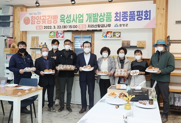 이번에 개발된 '함양곶감빵'은 휴천면 소재 빵 생산업체인 지리산황금나무에서 개발한 것으로 지난 22일 오후 함양곶감빵 육성사업 개발상품 최종품평회에서 선을 보였다.