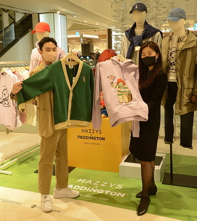 최근 롯데백화점 광복점 6층 헤지스 남성복 매장에서 캐릭터 ‘패딩턴 베어’와 콜라보한 제품 판매 행사가 열리고 있는 가운데 모델들이 의류를 들어보이고 있다. 롯데백화점 광복점에 따르면 이번 콜라보 행사는 내달 5일까지 진행한다. 특히 해당 브랜드 콜라보 상품들은 이번에 한정된 수량으로 출시해 희소성을 갖추고 있다. (사진=롯데쇼핑 제공)