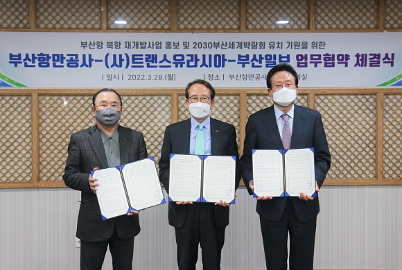 부산항만공사(BPA)가 28일 BPA 본사에서 부산일보, ㈔부산트랜스유라시아와 ‘부산 북항 재개발 브랜딩 홍보, 2030 세계박람회 유치 공동 노력’ 협약을 체결했다고 밝혔다.