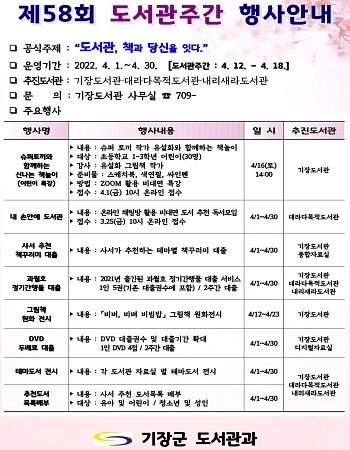 부산 기장군이 내달 12일부터 18일까지 ‘제58회 도서관주간’을 맞아 관내 공공도서관에서 다수 문화행사를 운영한다고 30일 밝혔다.
