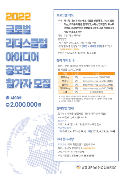 경성대학교 대학일자리플러스센터는 글로벌 역량강화를 위해 ‘글로벌 리더스클럽 아이디어 공모전’을 오는 27일부터 6월 3일까지 운영한다.